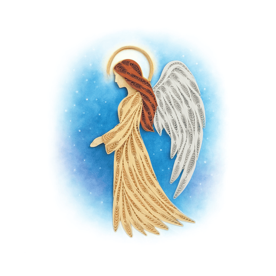 A sense of calm emerges through flowing quilling lines. This graceful card features an angel with white wings, rendered in layered paper coils that create softness, depth, and quiet movement. A timeless piece inspired by peace, light, and refined handcrafted detail.