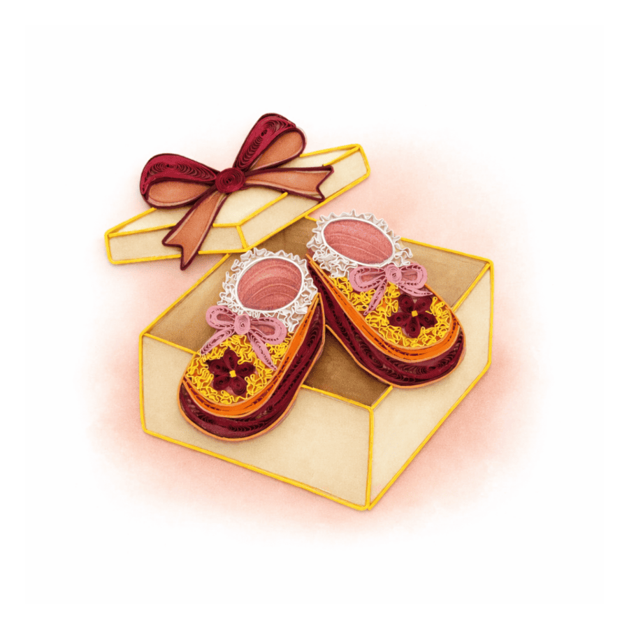 A sweet handmade quilling card featuring a pair of baby shoes nestled inside a gift box with a ribboned lid. Soft colors and delicate paper details create a warm, heartfelt design, perfect for baby showers, newborn celebrations, baby announcements, or welcoming a new little one into the world.