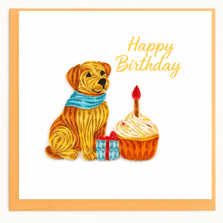 Celebrate in the cutest way with this birthday-themed quilling card! A happy puppy sits beside a frosted cupcake topped with a candle, with a little gift box adding extra party vibes. The playful composition and bright colors make it ideal for birthdays of all ages—especially for dog lovers. It’s a fun, heartfelt card that feels like a mini celebration the moment someone opens it.
