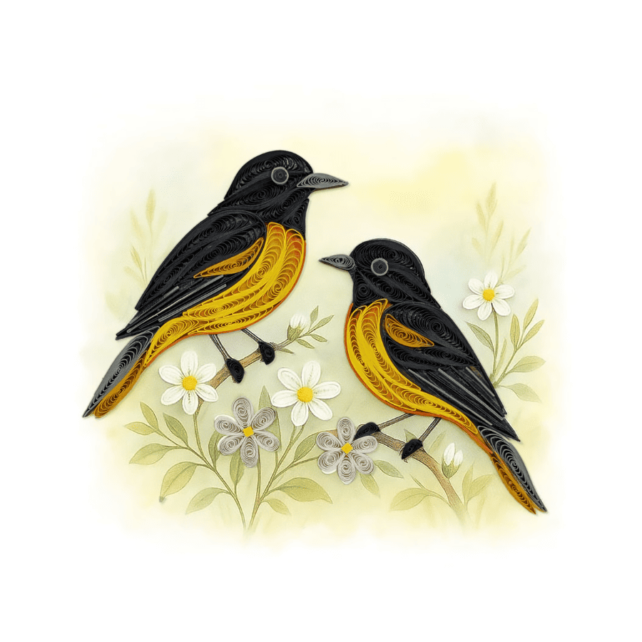 Two orioles resting among soft florals, crafted in layered paper quilling with warm yellow tones and gentle botanical details.