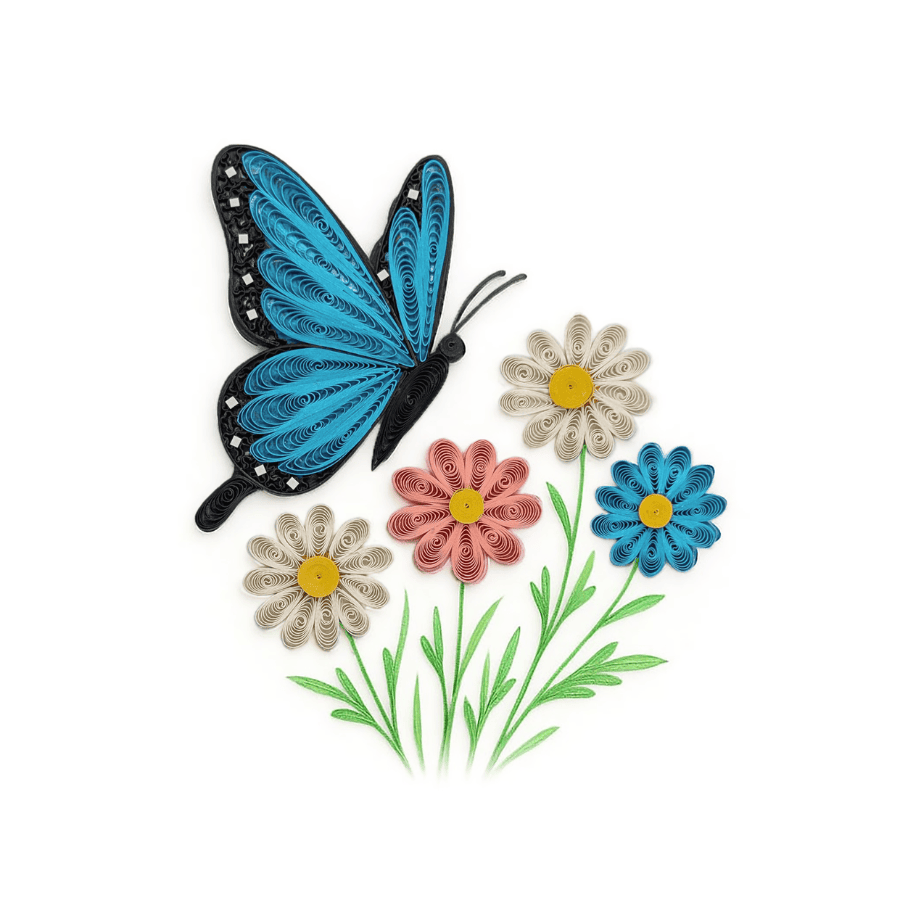 Paper quilling artwork featuring a blue butterfly hovering among delicate flowers, built from layered paper coils for a light, airy composition.