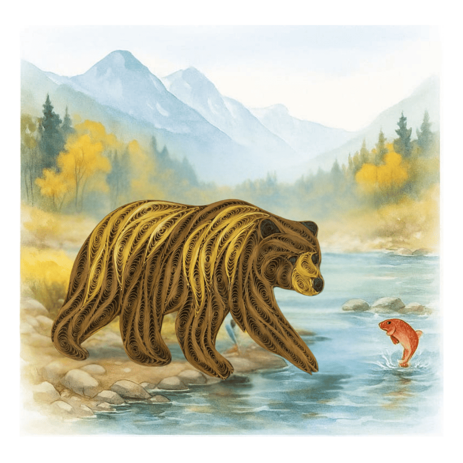 This quilling card portrays a powerful brown bear reaching into a flowing river as a salmon leaps from the water. Intricately layered paper coils create rich texture throughout the bear’s thick fur, giving the animal weight and realism. The surrounding mountain landscape and soft autumn tones enhance the natural wilderness atmosphere, making this design perfect for wildlife lovers, rustic themes, and nature-inspired occasions.