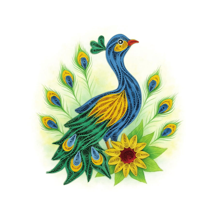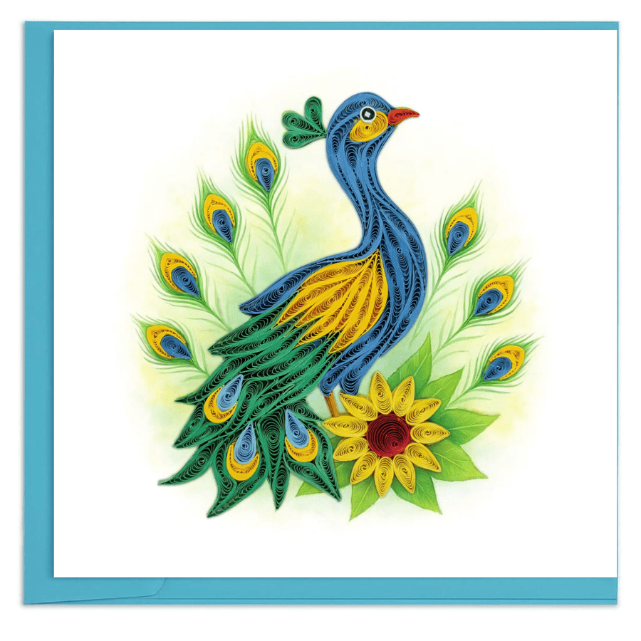 Vibrant elegance is shaped through flowing quilling lines. This striking card features a colorful peacock surrounded by layered feathers, rendered in sculpted paper coils that create movement, richness, and graceful balance. A refined piece inspired by beauty, pride, and handcrafted detail.