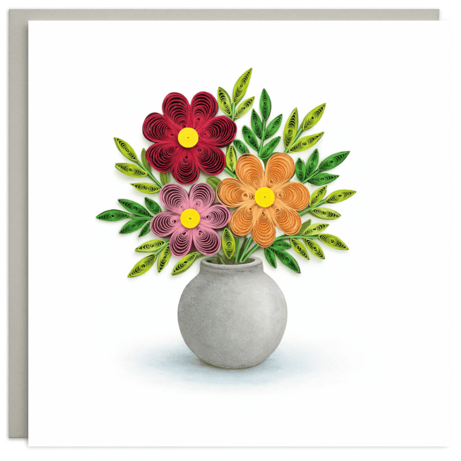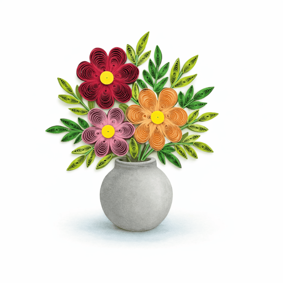 A bright floral arrangement handcrafted with detailed paper quilling, featuring layered blossoms and fresh green leaves displayed in a simple vase. This cheerful design suits birthdays, thank you notes, housewarming wishes, or everyday greetings that need a warm, uplifting touch.
