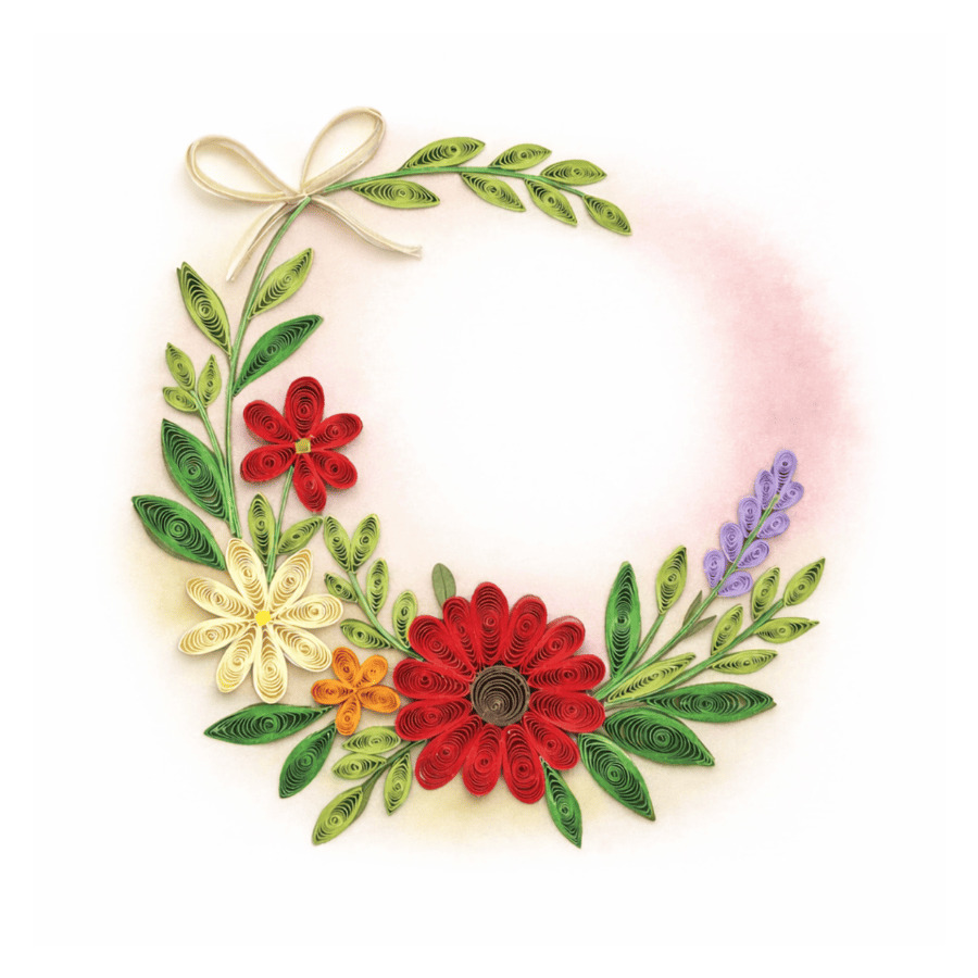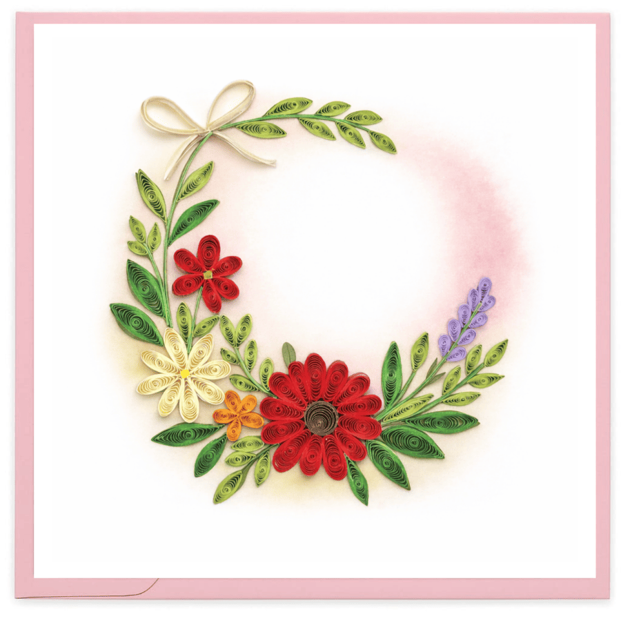 A delicate floral wreath crafted from layered paper quilling, featuring soft greenery and vibrant blossoms arranged in a balanced circular design. The open center leaves space for any message, making this card versatile for birthdays, celebrations, thank you notes, or heartfelt everyday greetings.