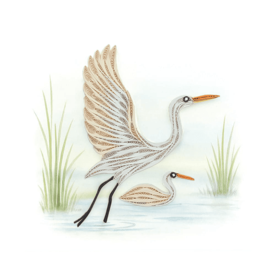 A calm nature-inspired quilling card featuring an elegant heron with its young in a peaceful wetland scene. Soft colors and flowing paper details create a gentle, timeless design, suitable for many occasions such as birthdays, thank you notes, or nature lovers’ gifts.