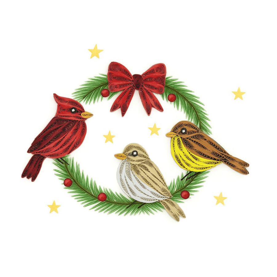 This quilling card showcases birds and pine branches created with dense paper coils and curved strips. The wreath shape is defined by layered quilling details, adding dimension and festive texture.