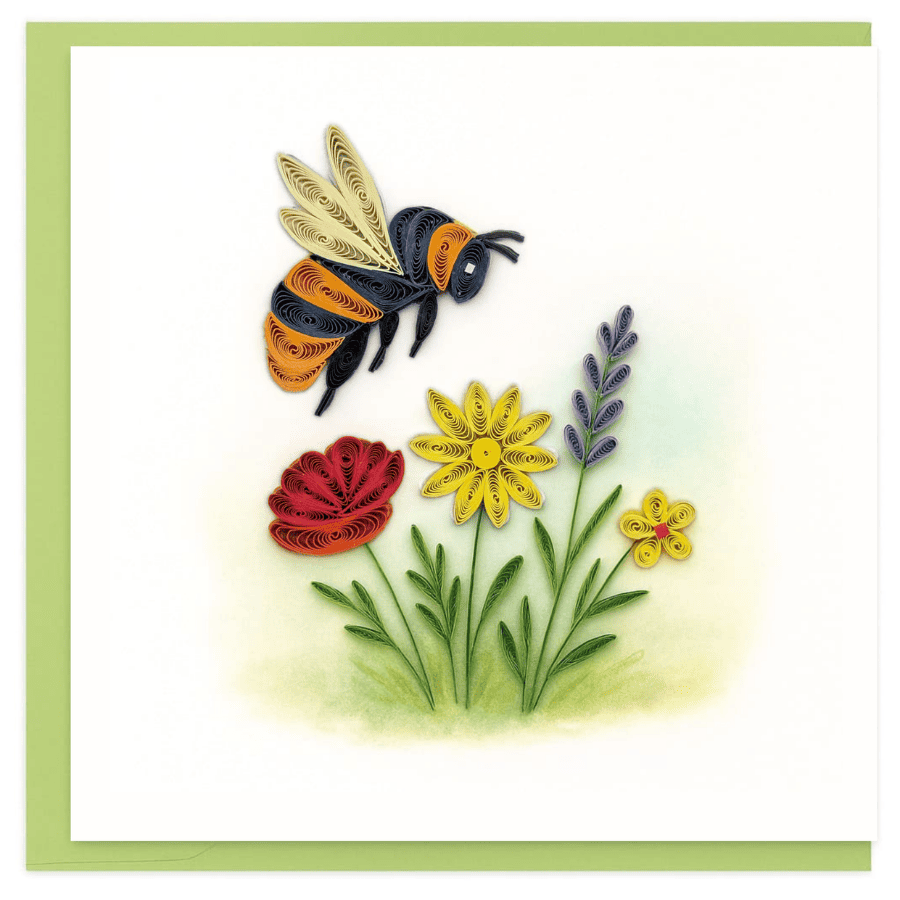 A lively honey bee hovers above a small meadow of blooming wildflowers, crafted with layered quilling details that create gentle motion and depth. The mix of bright petals and soft greenery evokes freshness, harmony, and the quiet beauty of nature in bloom.