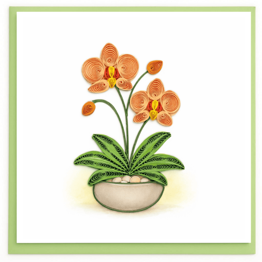 Handcrafted quilling card featuring a blooming orange orchid in a simple ceramic pot, made with layered paper coils and vibrant details, perfect for birthdays, thank you notes, housewarming gifts, or elegant everyday greetings.