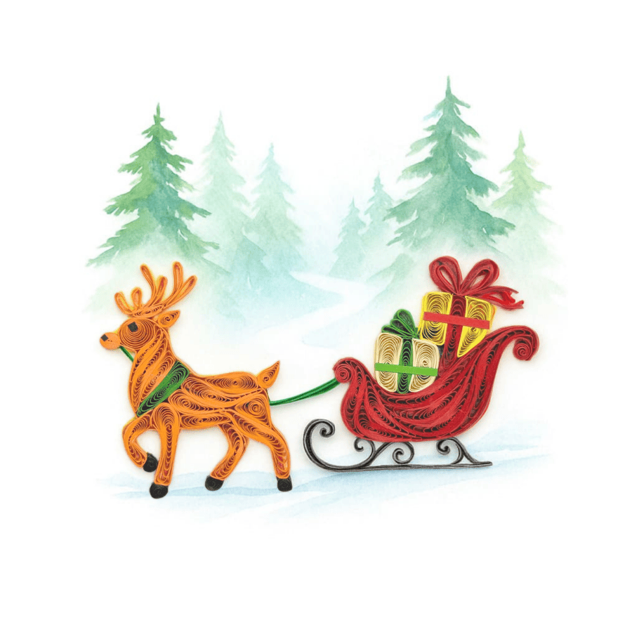 Festive motion is captured through flowing quilling lines. This cheerful card features a reindeer pulling a sleigh filled with gifts, shaped in layered paper coils that create rhythm, depth, and holiday charm. A refined piece inspired by winter magic and handcrafted detail.