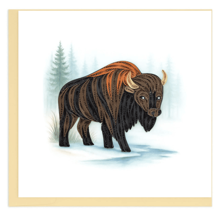 This quilling card features a powerful bison standing in a quiet snowy landscape. Carefully layered paper coils create rich texture throughout the thick fur, giving the animal depth, weight, and presence. The soft winter forest backdrop enhances the calm yet rugged atmosphere, making this design ideal for wildlife lovers, rustic themes, or nature-inspired greetings across all regions.