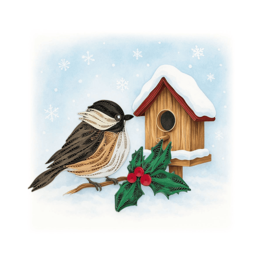 Quiet winter charm is shaped through delicate quilling lines. This serene card features a small bird perched beside a snow-covered birdhouse, accented with holly leaves and soft falling snow. Layered paper coils create warmth, balance, and a peaceful seasonal mood.